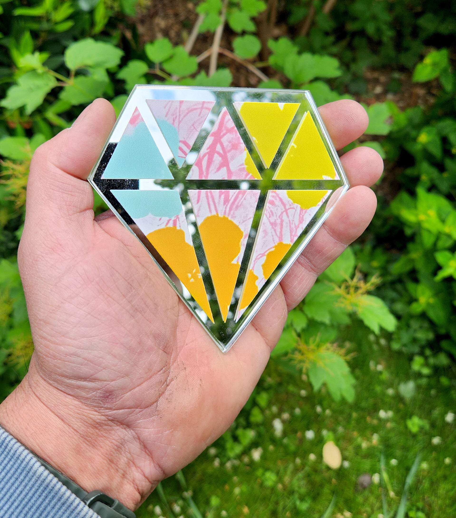 Chaque diamant est réalisé en miroir de 3 mm d’épaisseur, imprimé en UV haute définition pour un rendu éclatant et durable. Fabriqués artisanalement dans mon atelier parisien, ces diamants mêlent précision, brillance et esthétique pop.