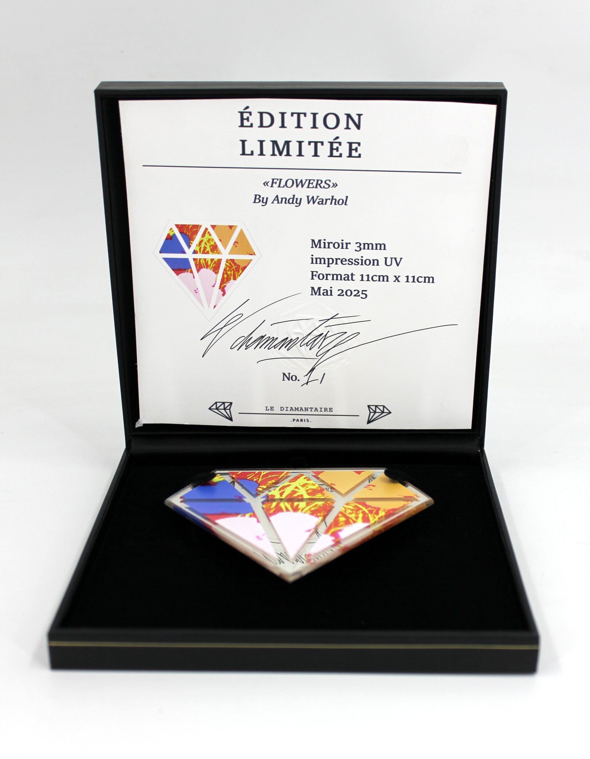 Chaque diamant est réalisé en miroir de 3 mm d’épaisseur, imprimé en UV haute définition pour un rendu éclatant et durable. Fabriqués artisanalement dans mon atelier parisien, ces diamants mêlent précision, brillance et esthétique pop.