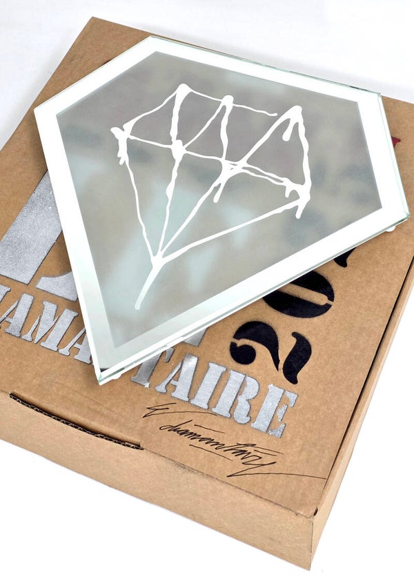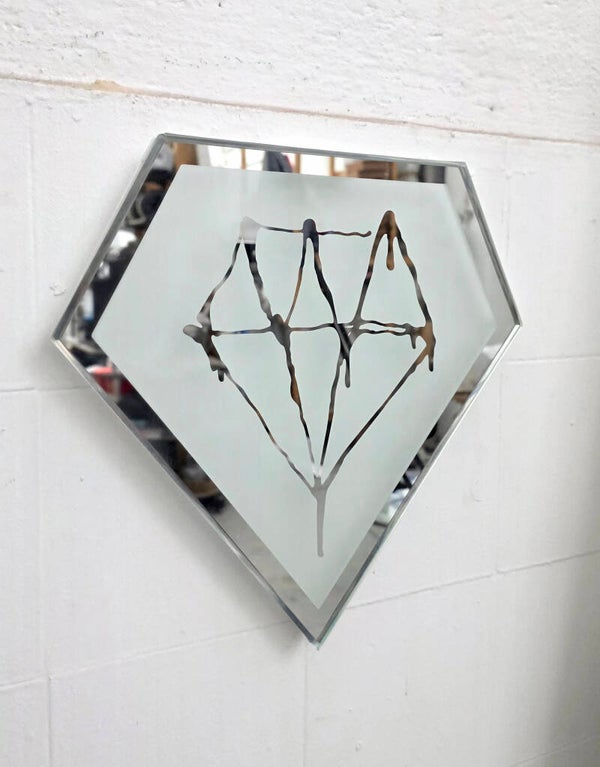 Née d’un motif urbain créé en 2012, Scratch transpose dans l’atelier un geste brut issu de la rue. À l’origine, une bouteille bricolée servait à tracer des lignes rapides et instinctives sur le béton et les trottoirs. Aujourd’hui, ce même mouvement est gravé par sablage dans du miroir récupéré lors d’un évènement à l’Orangerie de Versailles, offrant une seconde vie à cette matière précieuse.