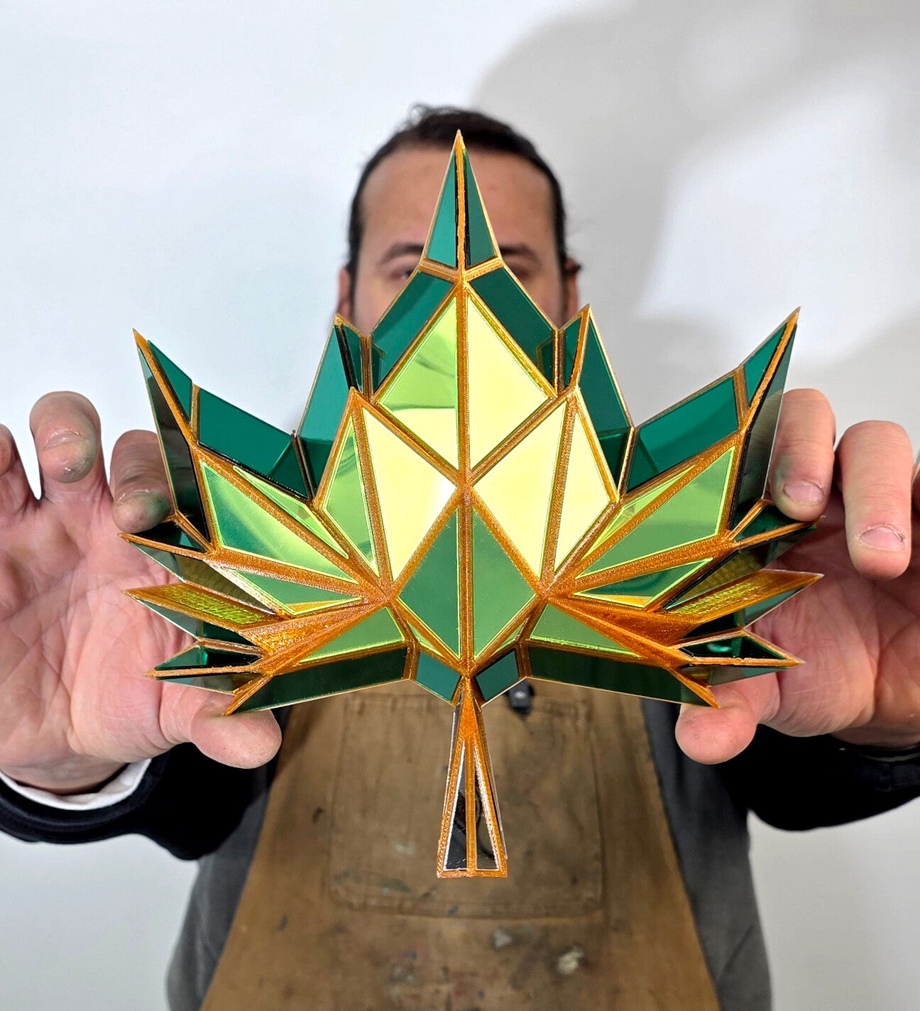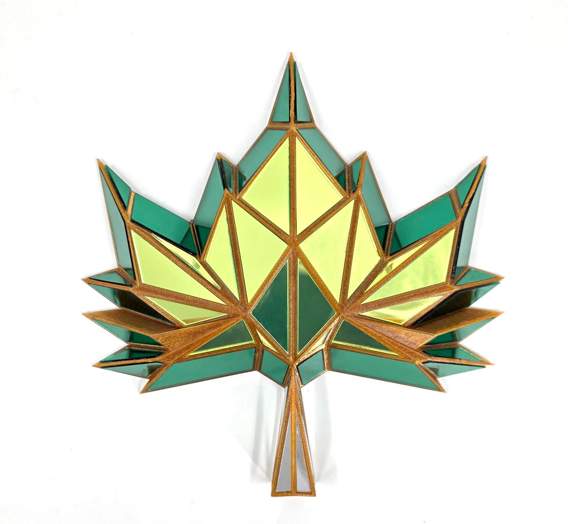 La structure externe est réalisée en PETG marron, rappelant l’écorce et les teintes chaudes de l’automne. Les facettes sont recouvertes de miroir acrylique vert, jouant avec les reflets pour évoquer les nuances de la feuille à travers les saisons : du vert profond à des tons plus dorés.