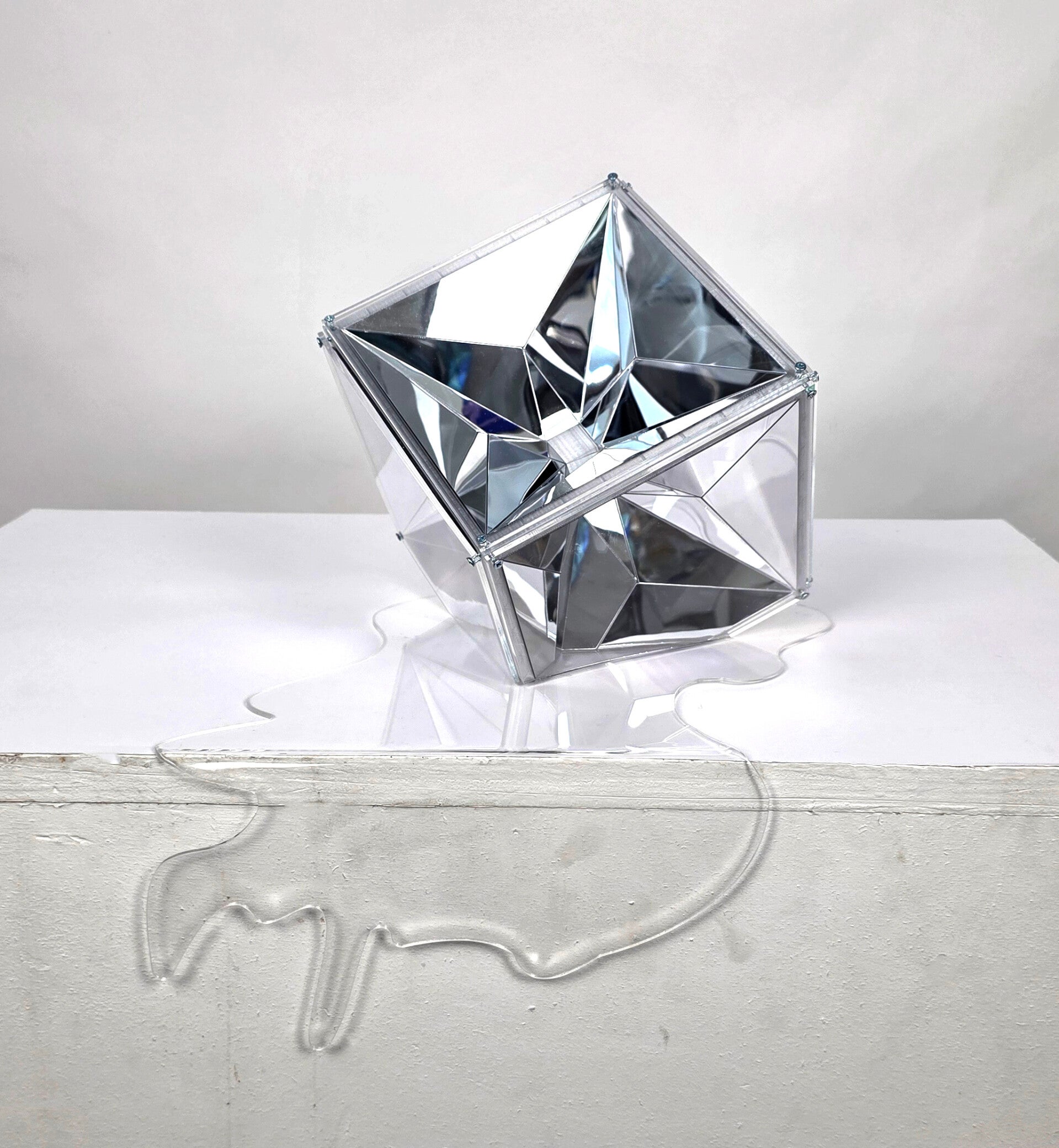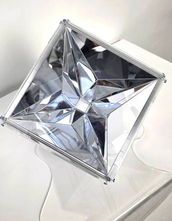 J’ai travaillé cette pièce comme un véritable jeu d’optiques : les facettes miroir captent la lumière, se répondent, et recréent ces reflets instables qu’on observe dans un vrai bloc de glace.